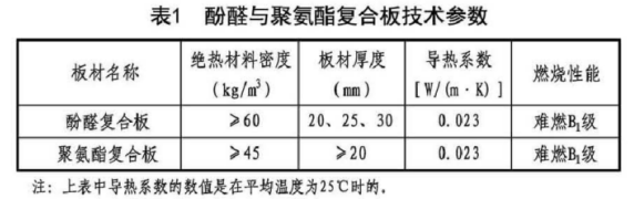 1.4酚醛与聚氨酯复合板的规格、性能、厚度等技术参数应符合设计规定。当设计无规定时,其技术参数不应低于表1的规定。